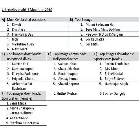 Bharti airtel, India’s leading global telecommunications company, released the findings of airtel Mobitude 2010, its annual survey to map onto mobile phone usage trends across the country. Based on a detailed analysis of data capturing all downloaded content by airtel mobile users in 2010, this survey is compiled at the end of every calendar year – thus bringing out the India’s preferences and favorites across various categories.