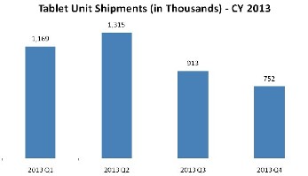 According to IDC's worldwide quarterly tablet tracker data for CY 2013, the overall India Tablet shipments for CY 2013 stood at 4.14 million units representing a year-on-year growth of 56.4% over CY 2012.