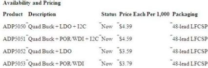 The ADP505x combines multiple buck regulators and LDOs (low-dropout regulators) into a single, compact 48-lead LFCSP (7 mm x 7 mm) package resulting in a power density solution of up to 25 W power design in only 310 mm2 PCB area. It is an extremely versatile multi-output regulator with four buck switching regulators (4 A, 4 A, 1.2 A, 1.2 A) and one 200-mA LDO. The ADP5050 implements an IC interface that allows the input voltage to the device and the die temperature to be monitored, increasing the power solution’s overall reliability. Its integrated design allows a single IC to be designed into many different applications, reducing power supply design time.