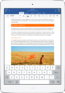 At the same time, these apps were created from the ground up for iPad. The large touch areas on the Ribbon and in overlay menus make it simple to create, edit and format documents using only touch. Resize and rotate objects like pictures with touch-friendly handles. When you hold and move the objects, text flows smoothly around them. No keyboard and mouse required. You can even use iPad features like voice dictation to draft a Word document or AirPlay® to project a presentation wirelessly on a TV screen.