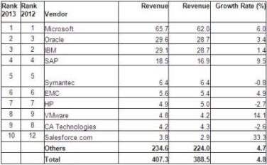 Top 10 Worldwide Software Vendors, Worldwide, 2012-2013 (Billions of Dollars)
