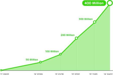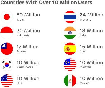 The amount of daily new users reached a record-breaking number of around 1.7 million per day, indicating rapid growth worldwide. This trend has continued and just 4 months after the last milestone of 300 million users. The amount of LINE users worldwide surpassed 400 million on April 1. Since the start of the this year the amount of countries with over 10 million registered users rose to a total of 10, including America, Korea, Malaysia, and Mexico.
