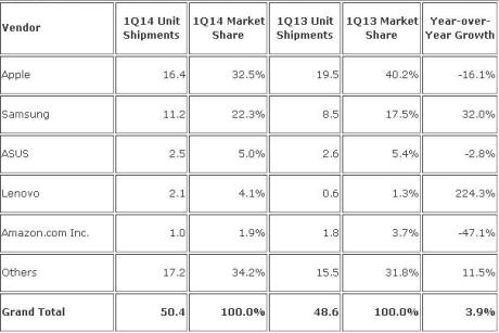 Top Five Tablet Vendors, Shipments, and Market Share, First Quarter 2014 (Preliminary Results, Shipments in millions)