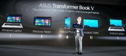 He also unveiled two revolutionary new products, Transformer Book V is the world’s first five-mode, three-in-one converged laptop, featuring a Windows and Android laptop, tablet and smartphone in one, and Transformer Book T300 Chi is a high-performance detachable notebook with the world’s thinnest 12.5-inch tablet display.