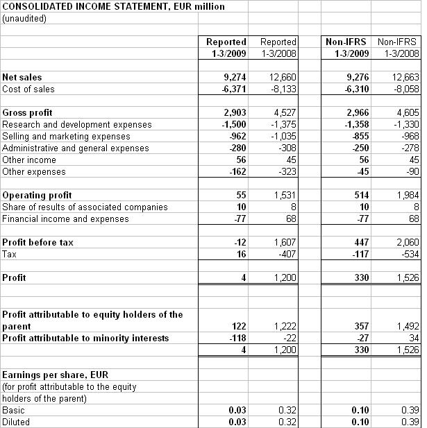 Company CEO Olli-Pekka Kallasvuo said, "In what has been an exceptionally tough environment, we continue to invest in a focused manner in consumer Internet services delivered across our broad portfolio of mobile devices. Combined, these solutions will drive our future growth. As an example in Q1, I am especially pleased with the performance of our first mass market touch product, the Nokia 5800 XpressMusic. Together with Comes With Music, it is a great example of Nokia providing solutions that consumers value.