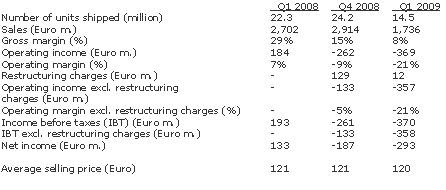 “As expected, the first quarter of this year has been extremely challenging for Sony Ericsson due to continued weak global demand. We are aligning our business to the new market reality with the aim of bringing the company back to profitability as quickly as possible,” said Dick Komiyama, President, Sony Ericsson. “The management intends to pursue an additional cost saving program targeting a further annual operating expense reduction of Euro 400 million, to be completed by mid-2010.”
