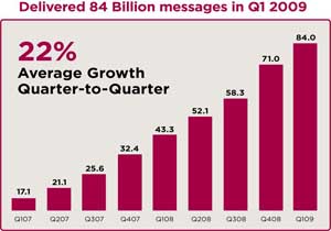 According to VeriSign, Q1 2009 witnessed delivery of 84 million messages across the globe. Valentine’s Day alone witnessed exchange of 1.06 billion messages. The quarter witnessed 18.5 % growth in traffic on a quarterly basis and 96 % on a y-o-y basis.