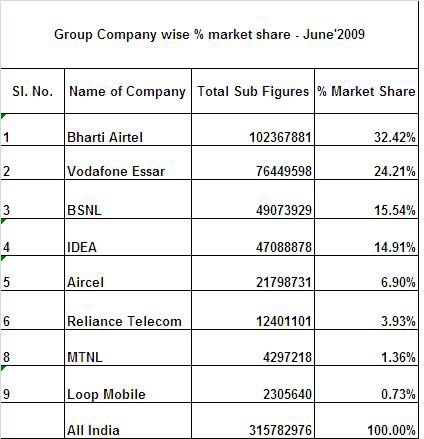Leading service provider, Bharti Airtel crossed the 100 million mark during the month for its mobile services, adding 2.8 million new subscribers and thereby taking its total count to 102.37 million. Its market share at the end of June 2009 stands at 32.42 % in the GSM space. It recorded a 2.83 % monthly growth rate. Following it is Vodafone Essar with a subscriber base of 76.5 million and market share of 24.21 %. Vodafone added 2.36 million subscribers in June at a monthly growth rate of 3.2 %.