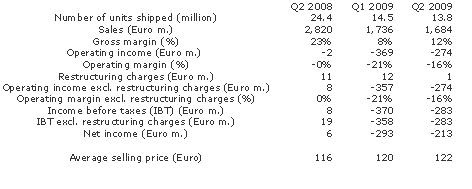 Sales for the company slid to euro 1.6 billion as compared to euro 2.8 billion in Q2 2008. Sales in Q1 were at euro 1.7 billion. The company managed to improve its performance on the net income front as it posted loss of euro 213 million in Q2 as compared to loss of euro 293 million in Q1 of this year. Average selling price of handset devices improved from euro 116 a year ago to euro 122 in Q2.