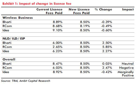 A new study by Ambit Capital reveals that Bharti will witness a 0.03 % impact on licence fee. Its current estimated licence fee percentage comes out to be 8.47 %. Reliance which pays 6.03 % as licence fee will see an impact of 2.47 %. Idea Cellular however stands to benefit out of the move as it currently pays 8.92 % as licence fee.