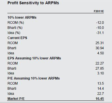 The impact of RCom’s new plan is that the effective tariff for the plan will be 36 paise per minute for voice services, says Morgan Stanley. This figure is 29 % lower than industry average revenue per minute (ARPM) of 52 paise per minute for voice services as on June’09. With data revenues the total revenue is estimated to be 42 paise per minute as compared to industry average of 58 paise per minute. The average cost per minute is 40 paise per minute for operators. For RCom to sustain this plan, it should either have a lower-than-industry average for cost (Morgan Stanley claims RCom has average cost of 35 paise) and more importantly be able to further reduce the cost. Otherwise it will end up with only wafer thin margins in the long-run.