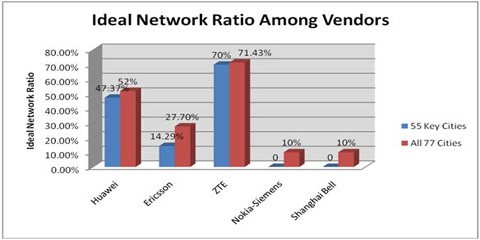 China Unicom conducted tests in 77 cities from August 31 to September 18 and found that the Ideal Index was achieved in 30 cities. ZTE, Huawei and Ericsson claimed top 3 positions in the Ideal Index cities. The tests were conducted by China Unicom’s Operation & Maintenance Division.