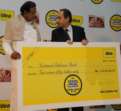 Idea Cellular presented a cheque of Rs 2.50 crore to Home Minister P Chidambaram to be contributed to the Prime Minister’s National Defence Fund. Rs 1.25 crore of this amount was collected through the ‘Talk for India Hour’ campaign initiated by the operator on the first anniversary of the Mumbai Terror Attack on November 26, 2009.