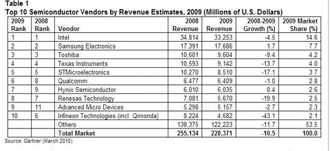 The company to be severely affected was Infineon which saw its revenues drop by 43.1% in 2009.
