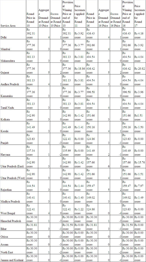 Bids for Rajasthan too increased at a healthy rate from Rs 144.54 crore to Rs 159.47 crore. The price for Rajasthan at the end of round 17 will rise by Rs 7.97 crore.