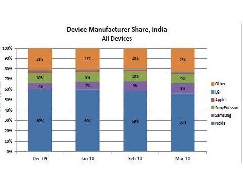 While Nokia enjoyed a market share of 60% till January 2010, by the end of March 2010 its market share in the requests from mobile devices in the mobile web space had dropped to 56%. However as a consolation to Nokia, the top 10 models with highest requests in the mobile web space are all Nokia-made.