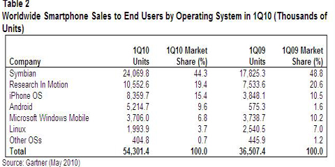 "In the first quarter of 2010, smartphone sales to end users saw their strongest year-on-year increase since 2006," said Carolina Milanesi, research vice president at Gartner. “This quarter saw RIM, a pure smartphone player, make its debut in the top five mobile devices manufacturers, and saw Apple increase its market share by 1.2 percentage points. Android’s momentum continued into the first quarter of 2010, particularly in North America, where sales of Android-based phones increased 707 per cent year-on-year.