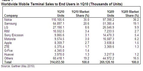 The global mobile phone sales to end-users totaled 314.7 million units in Q1 2010 at a 17% yearly growth rate, says research firm, Gartner.