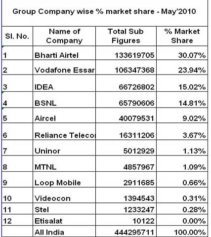 Bharti Airtel added 3 million new subscribers in the month while Vodafone Essar which had added the highest in April, 2010 recorded 2.59 million subscribers. Idea Cellular added 1.4 million subscribers while Aircel added 1.6 million subscribers.