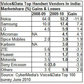 Handset major Nokia remained the market leader with 52% share, despite a 15% revenue dip to Rs 14,100 crore (down from Rs 16,567 crore in 2008-09). The Finnish giant's share was gobbled up by the Indian-brand handsets, and by Samsung. Nokia launched 22 devices during the year, selling them though over 200,000 retail outlets across the country (with 45% in rural India), and supporting them with over 700 service centers across 400 towns and cities. But its services thrust diluted its focus on handsets.